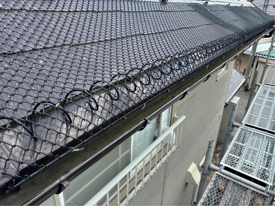 2,金網は**菱形金網(網目20 mm)**を採用。屋根材の種類(瓦・スレート・鋼板など)に合わせて特殊部品を使用して設置できるようになっている。