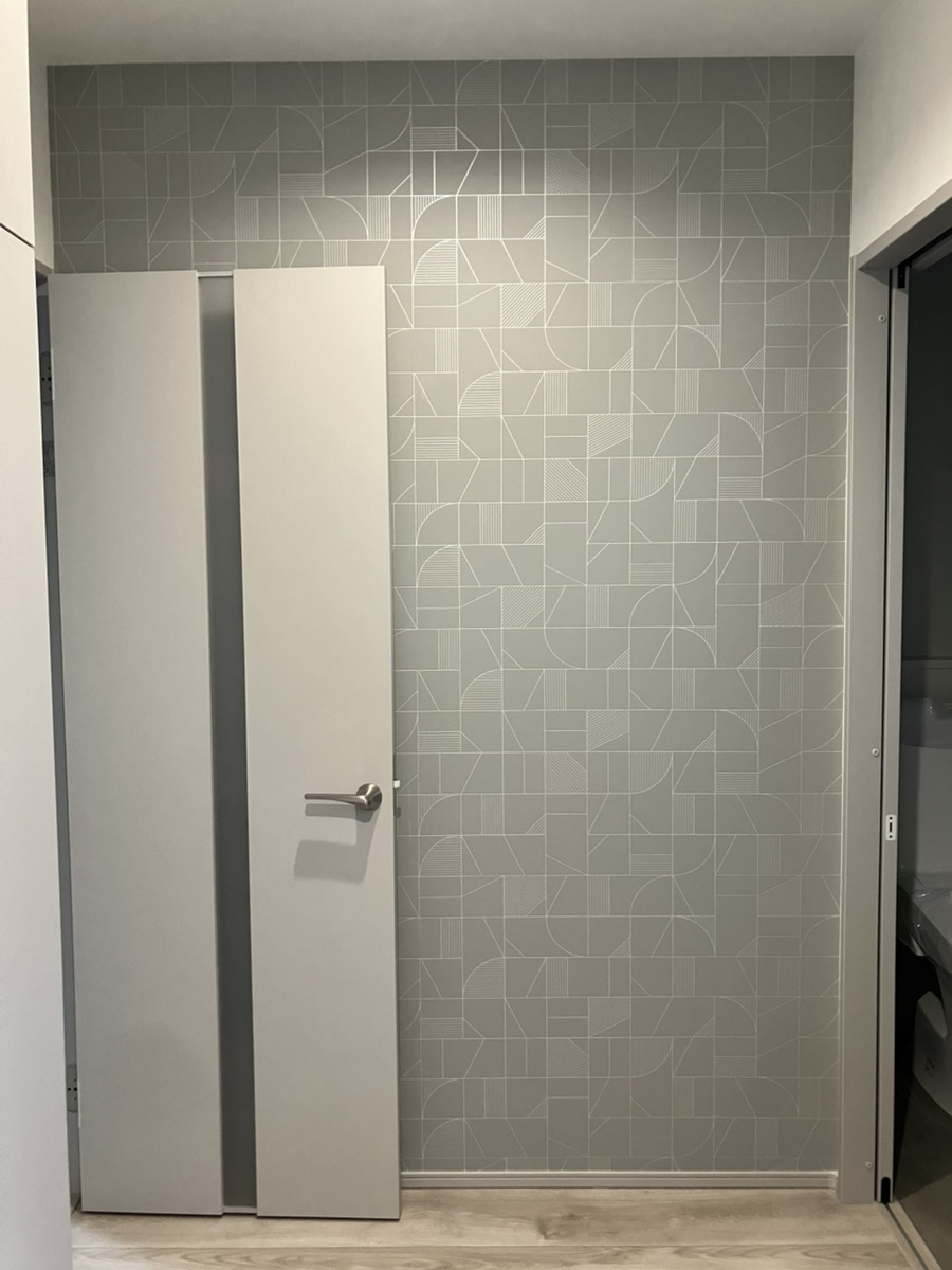 おしゃれな幾何学模様のクロスが印象的な空間です