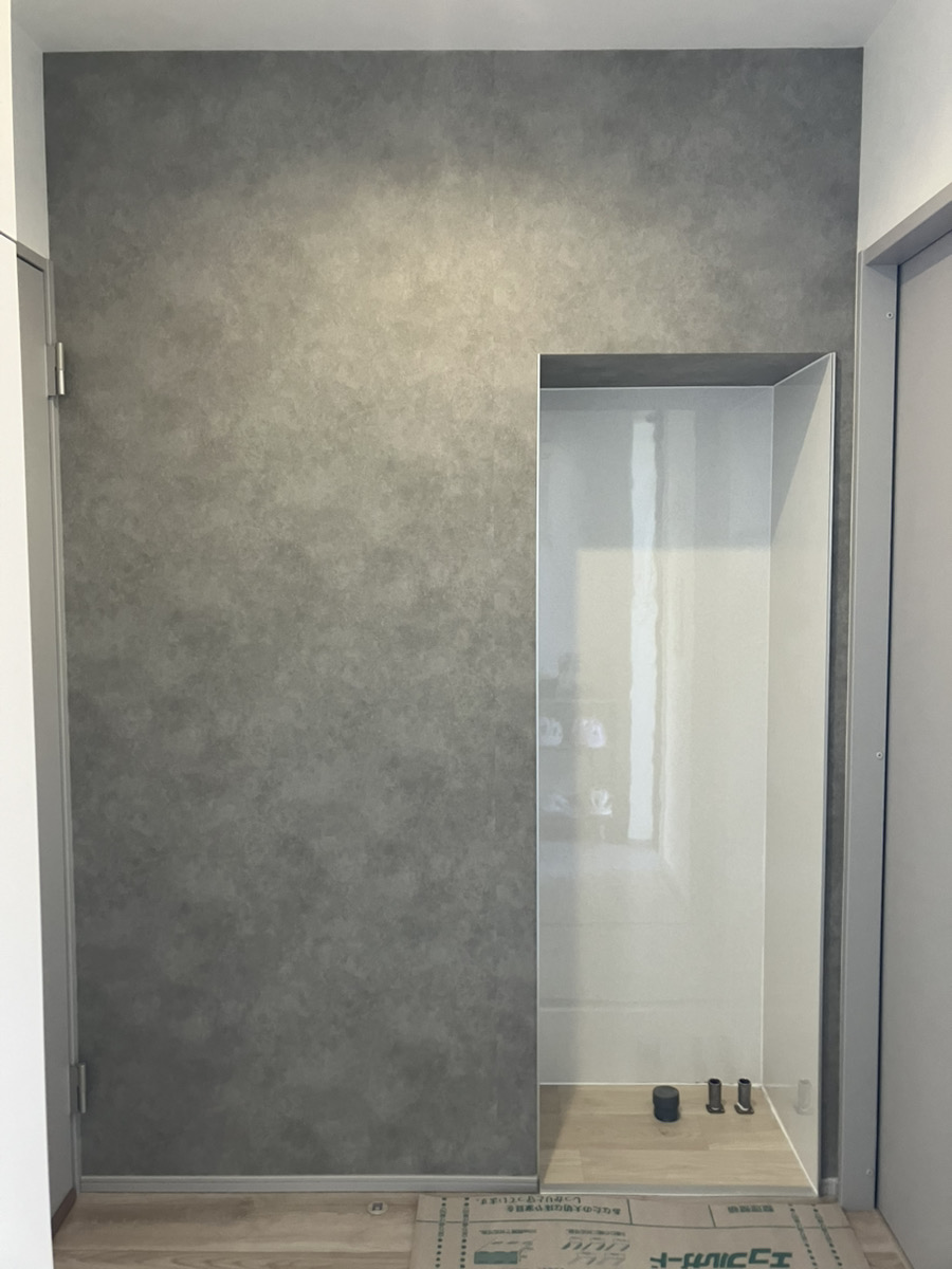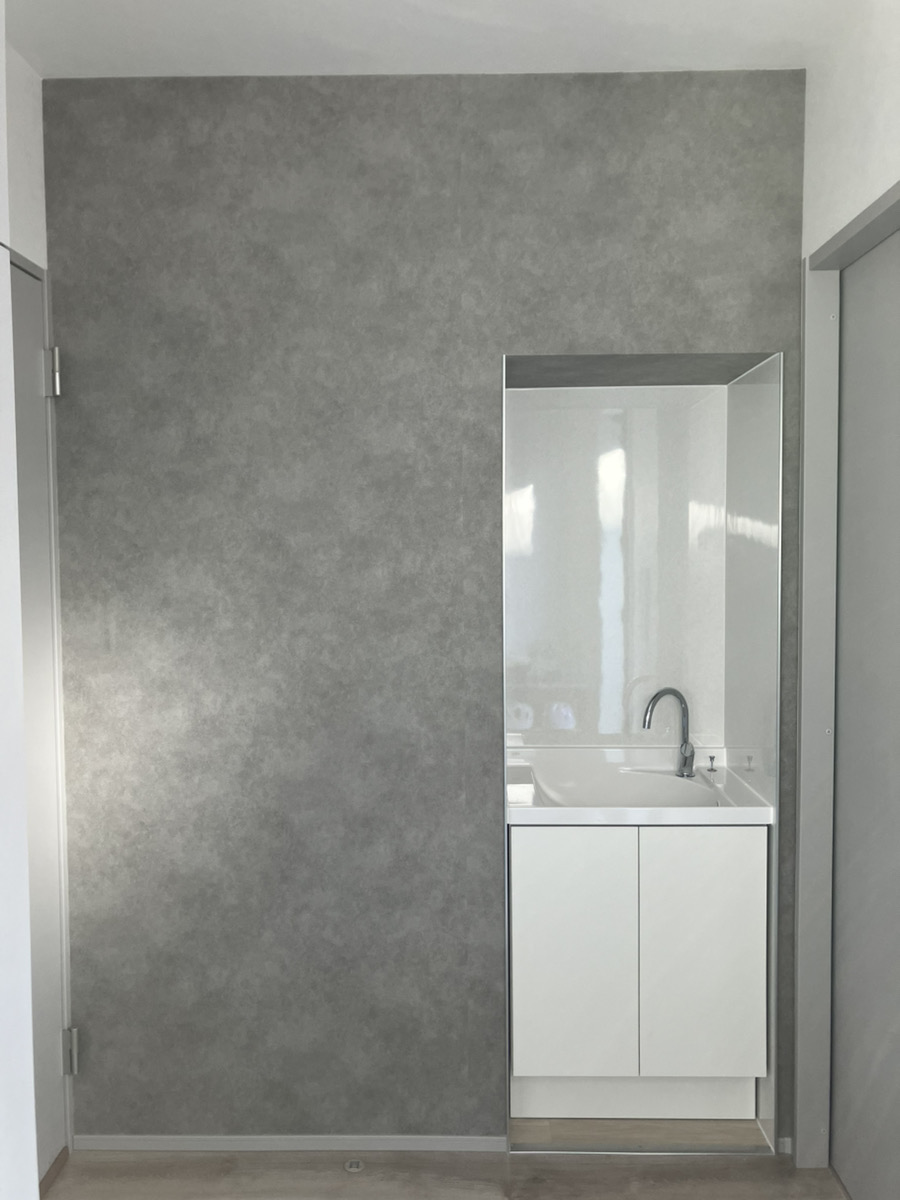 周りの壁も、雰囲気をガラッと変えてグレーのコンクリート調クロスへ貼り替えました。