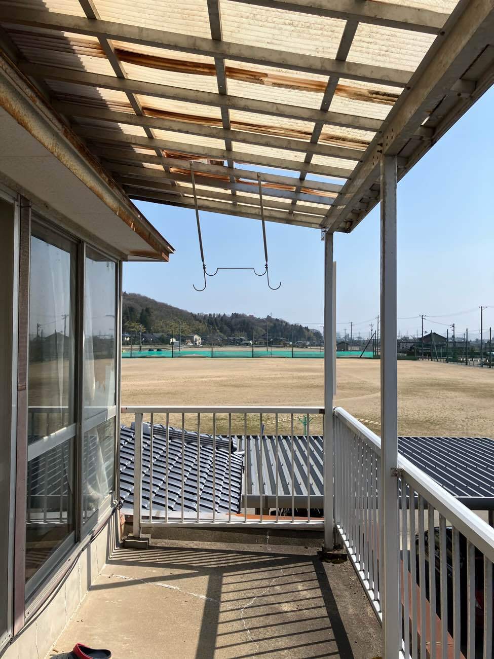 屋根と手摺りを外しベランダ床下地の防水下地として樹脂モルタルにて補修しました。