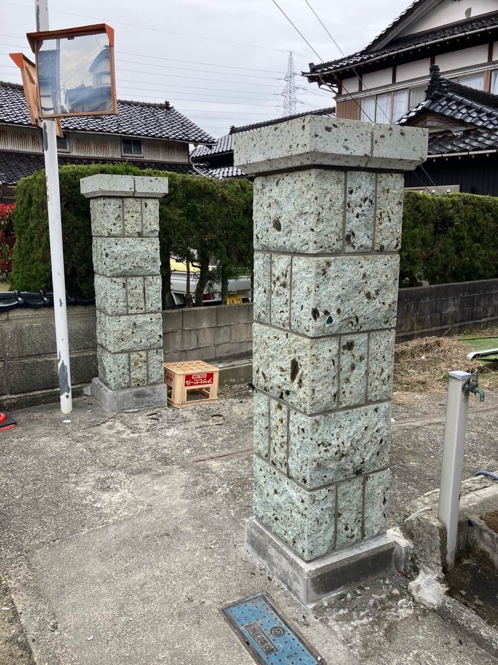 鉄筋を入れて強固にした大谷石の門柱ができました。