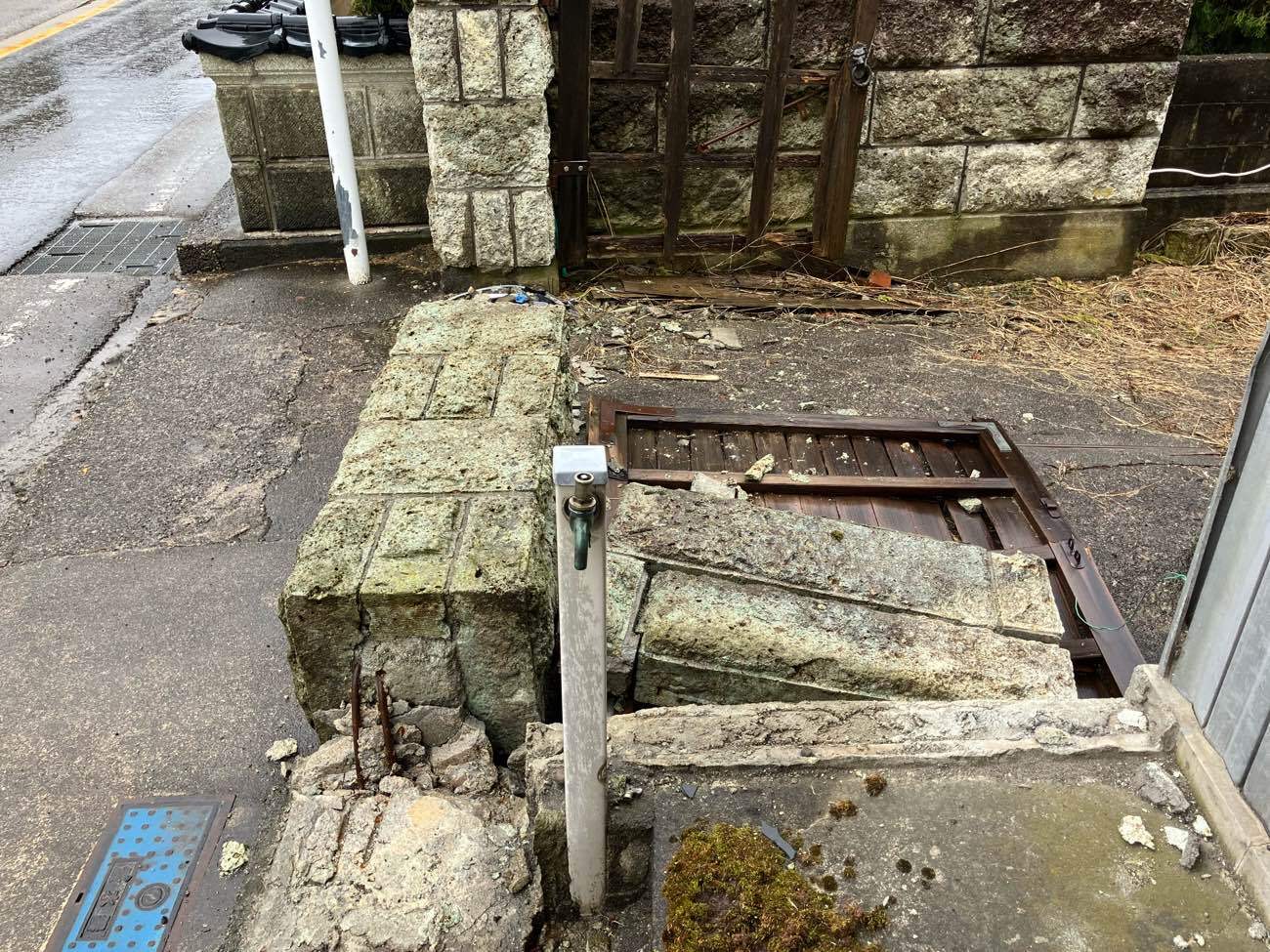 大谷石の門扉と木製の門扉か色々な原因により倒壊してしまいました。