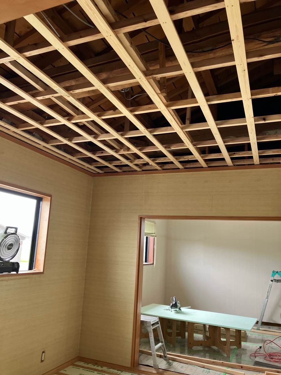 床は畳を撤去し、木下地してフローリングを貼ります。天井は下地ごと解体して木下地、プラスターボード、クロス貼りにて仕上げていきます。