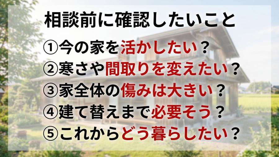 こうした「日々の不満や希望」が見えてくると、リノベーションで十分解決できるのか、それとも骨組みからやり直す建て替えまで視野に入れた方がいいのか、自然と方向性が見えやすくなります。