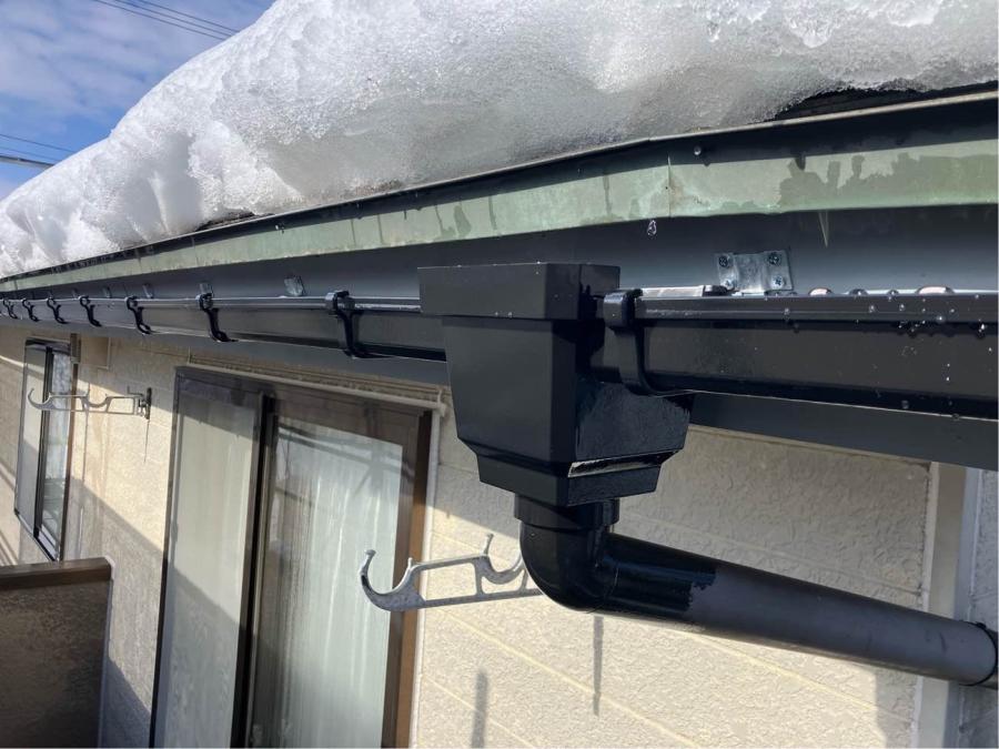 工事の際足場設置させていただいたので、附帯塗装(軒天、雨樋、庇)の施工。破風・鼻隠しは板金巻きさせていただき細かな箇所もキレイにさせていただきました。破風、鼻隠し板金巻きはニスクマットグレーにて施工させていただきました。